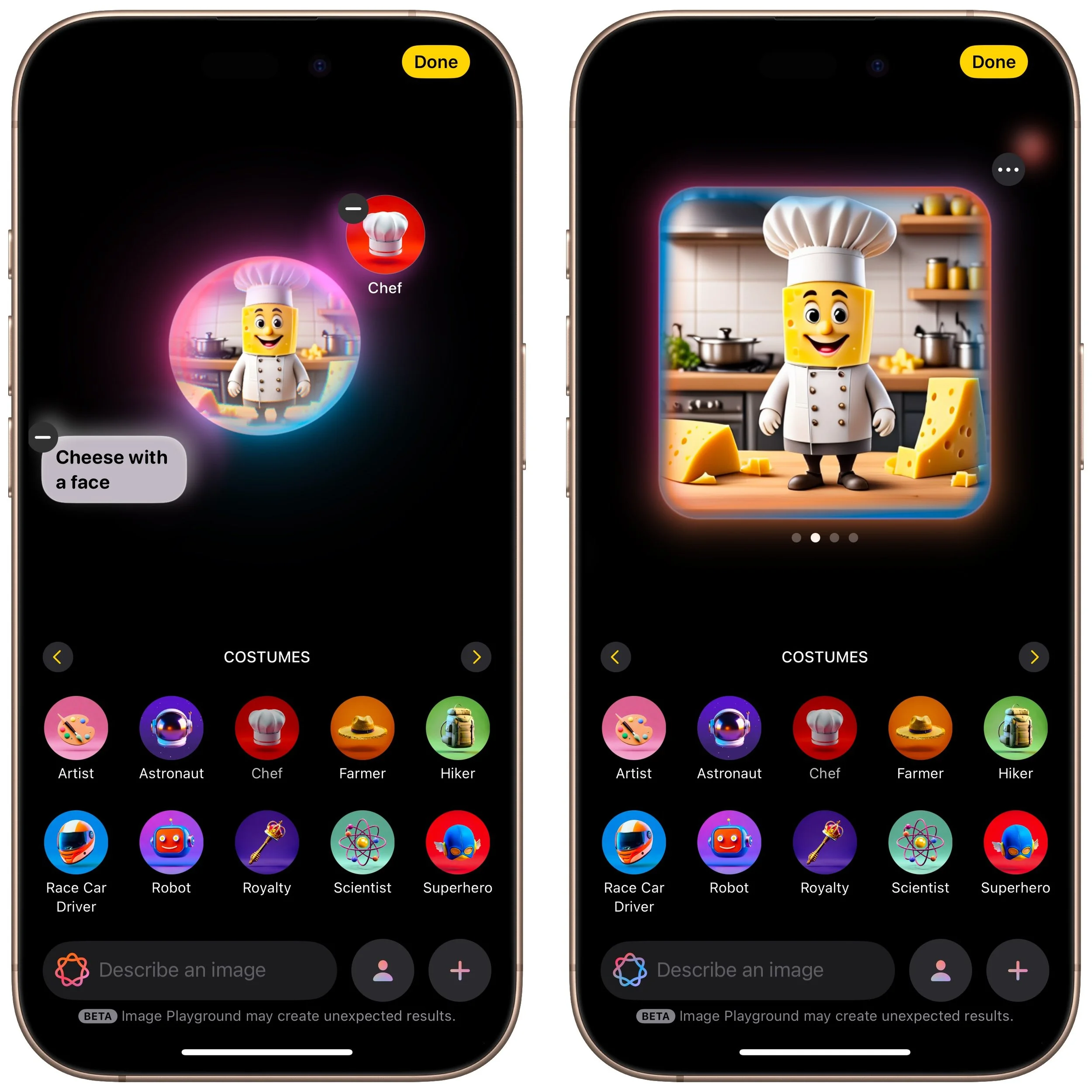 To get started, type a description or select a photo, then customize your image with themes, costumes, or accessories. Swipe left to see different versions of the image, and tap the ••• button to save or share your creation. Saved images sync across all your Apple devices.