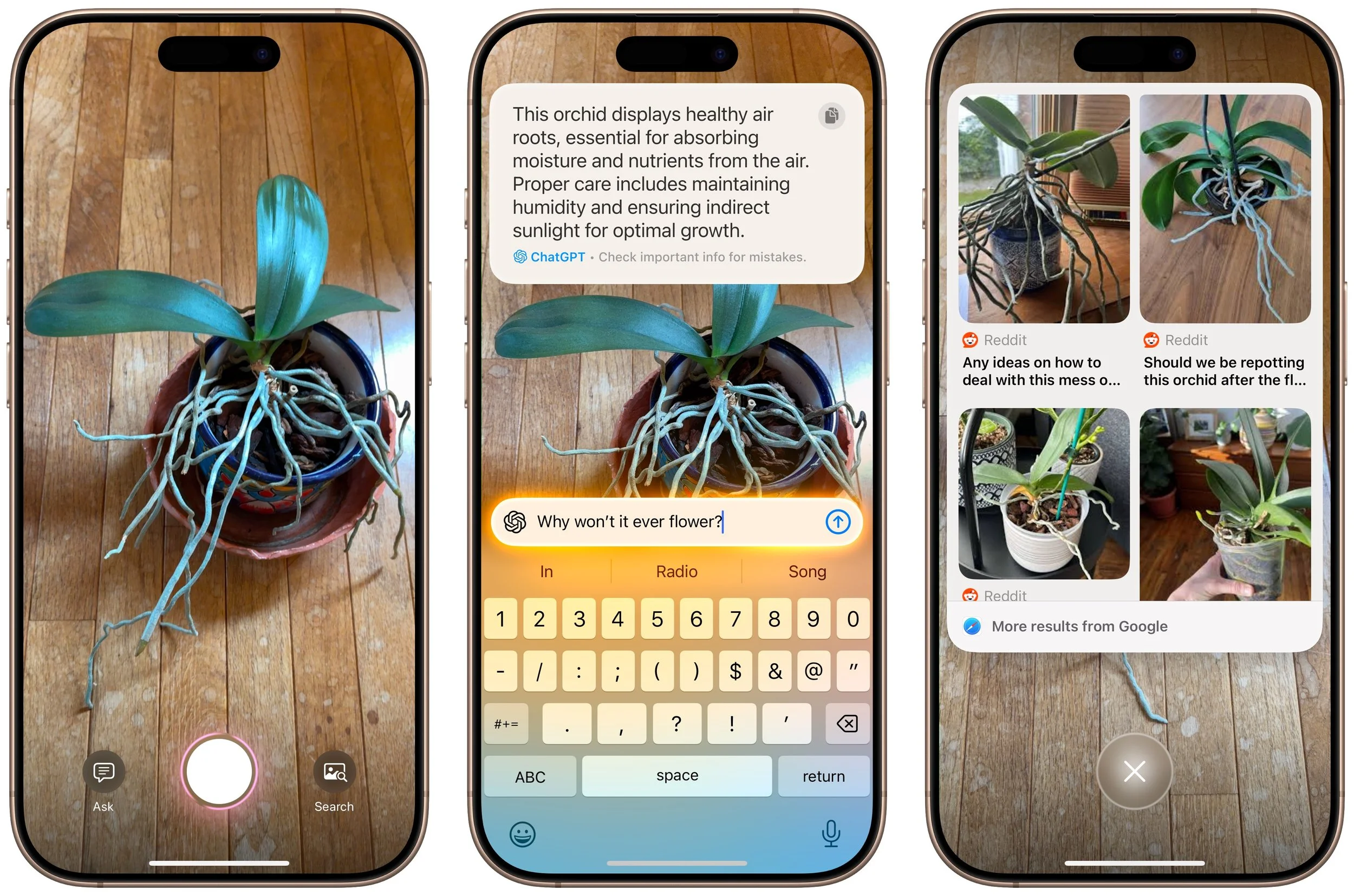 On iPhone 16 models, Visual Intelligence is a new feature tied to the Camera app. Press and hold the Camera Control button to activate it, revealing two options: