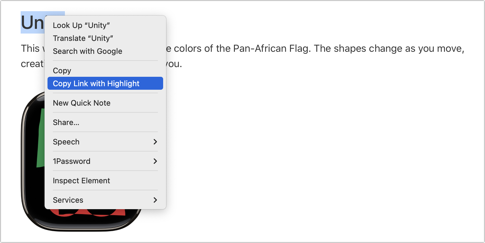 If you have Control- or right-clicked on text in a Web browser, you may have seen an oddly named command: Copy Link to Highlight. When you choose it, it puts a URL on your clipboard, not just to that page, as Copy Link Address would, but also to the selected text. You can use this URL to make a link or share it directly, and when someone clicks it, their browser scrolls to the selected text, helping them find the text you intend them to read. For example, compare this link to Apple’s long Apple Watch faces page with this one that points directly to the Unity watch face most of the way down. All Web browsers can follow these links, but Google Chrome was the first to let you make them, and you’ll also find the feature in Arc, Microsoft Edge, and Vivaldi. Apple recently got on board with Safari 18 for Mac and Safari on iOS 18. The Link to Text Fragment extension adds the feature to other Chromium browsers and Firefox.