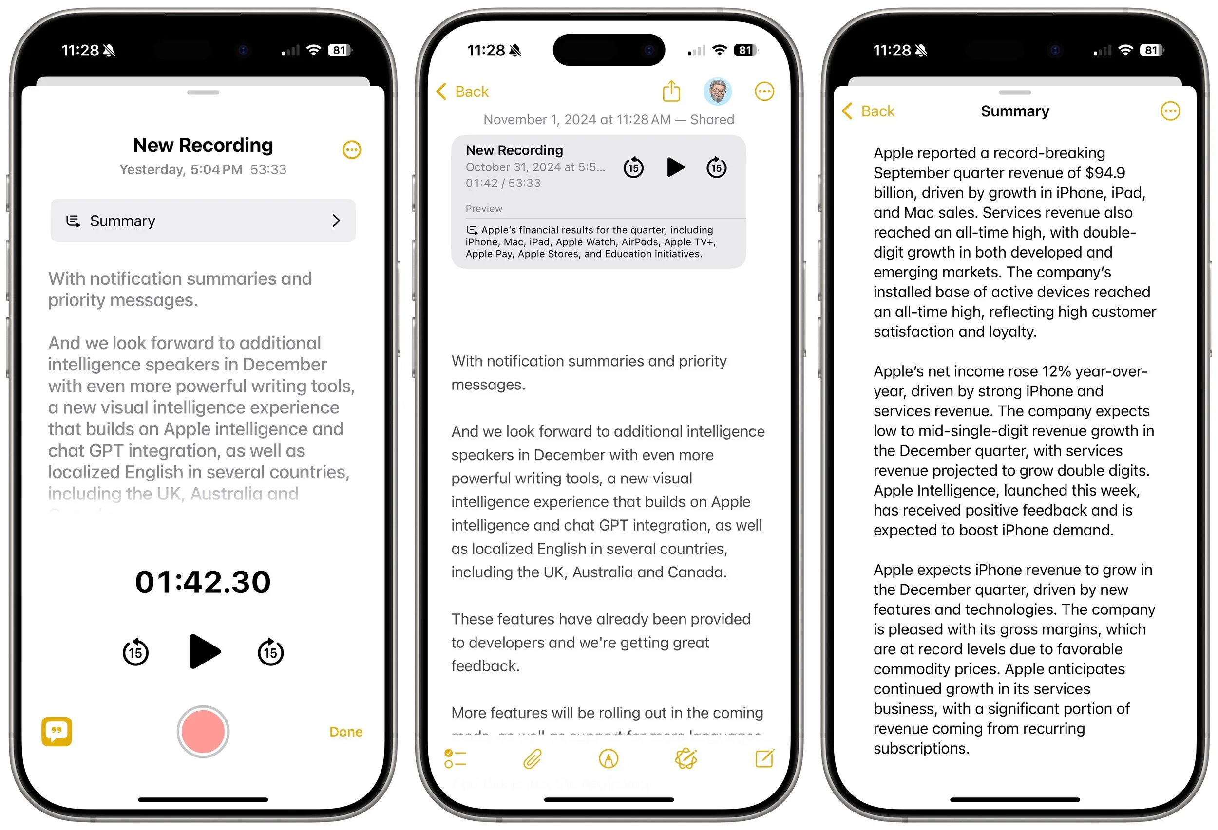 Apple Intelligence offers major advances for the Notes and Phone apps: audio recording, transcription, and summarization.