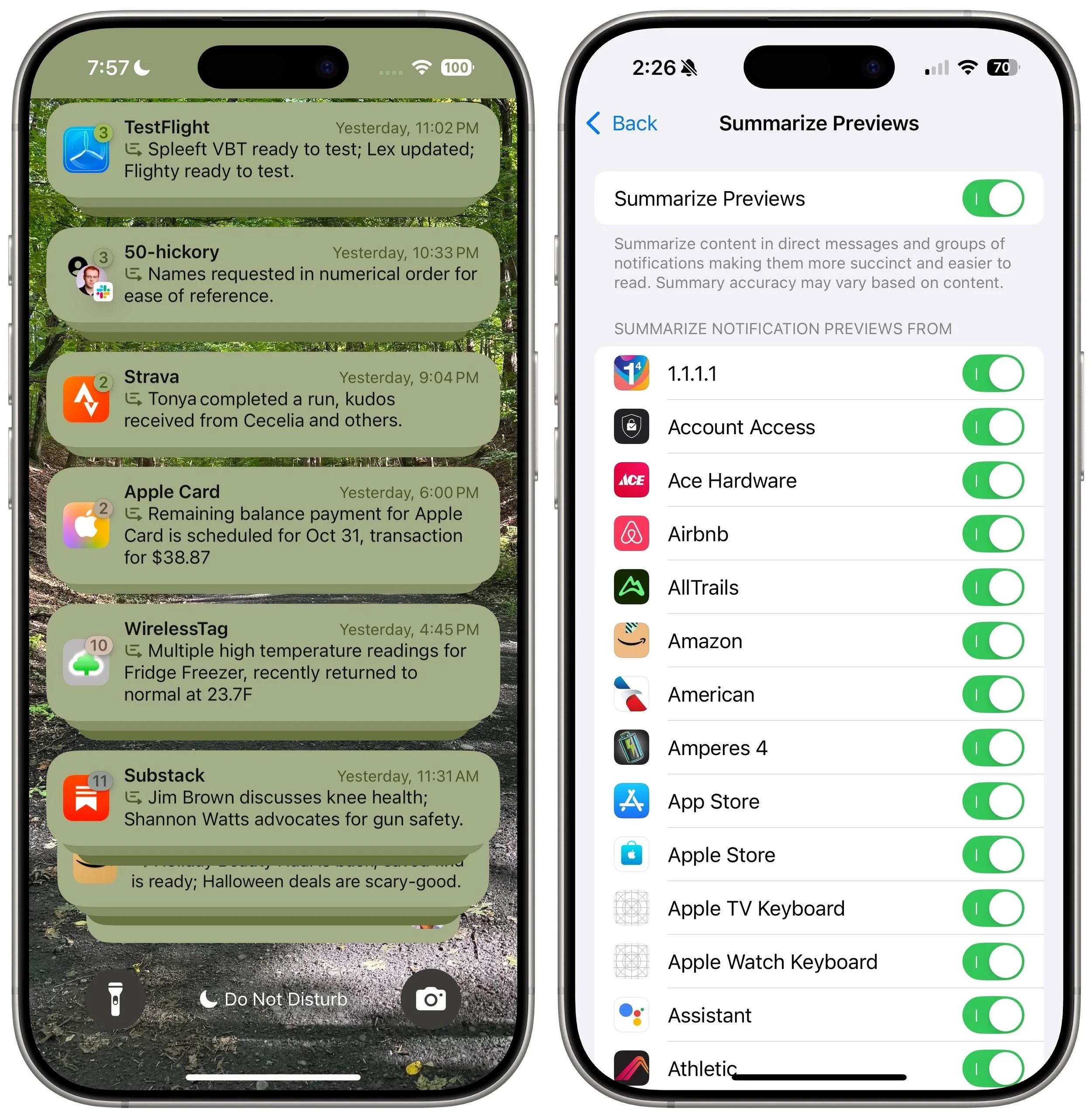 Apple has long been sensitive about how distracting our devices can be due to numerous apps posting notifications throughout the day. Apple Intelligence tries to help by summarizing lengthy individual notifications and groups of notifications. Notification summaries probably won’t rock your world, but it can be nice to have a sense of what’s going on with a group of notifications before you wade into an involved conversation. If you don’t like the summaries for particular apps, turn them off in Settings > Notifications > Summarize Previews.