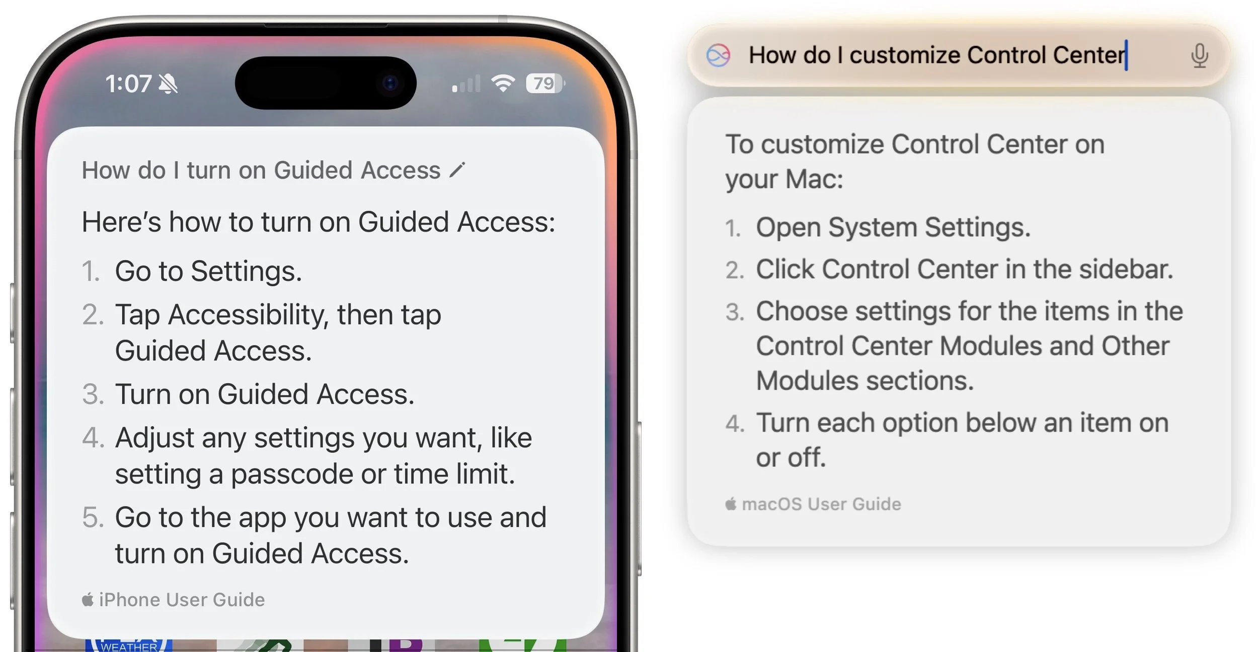 Apple has promised a lot for Siri but hasn’t delivered much yet (they promised the big updates are coming in 2025). A new interface replaces the animated circle with a glowing light and the option to type your query rather than speak it (double-tap the bottom of your screen). However, the only functional improvement from Apple Intelligence so far seems to be Siri’s awareness of the iPhone, iPad, and Mac user guides. If you’re unsure how to accomplish a built-in task, try asking Siri.