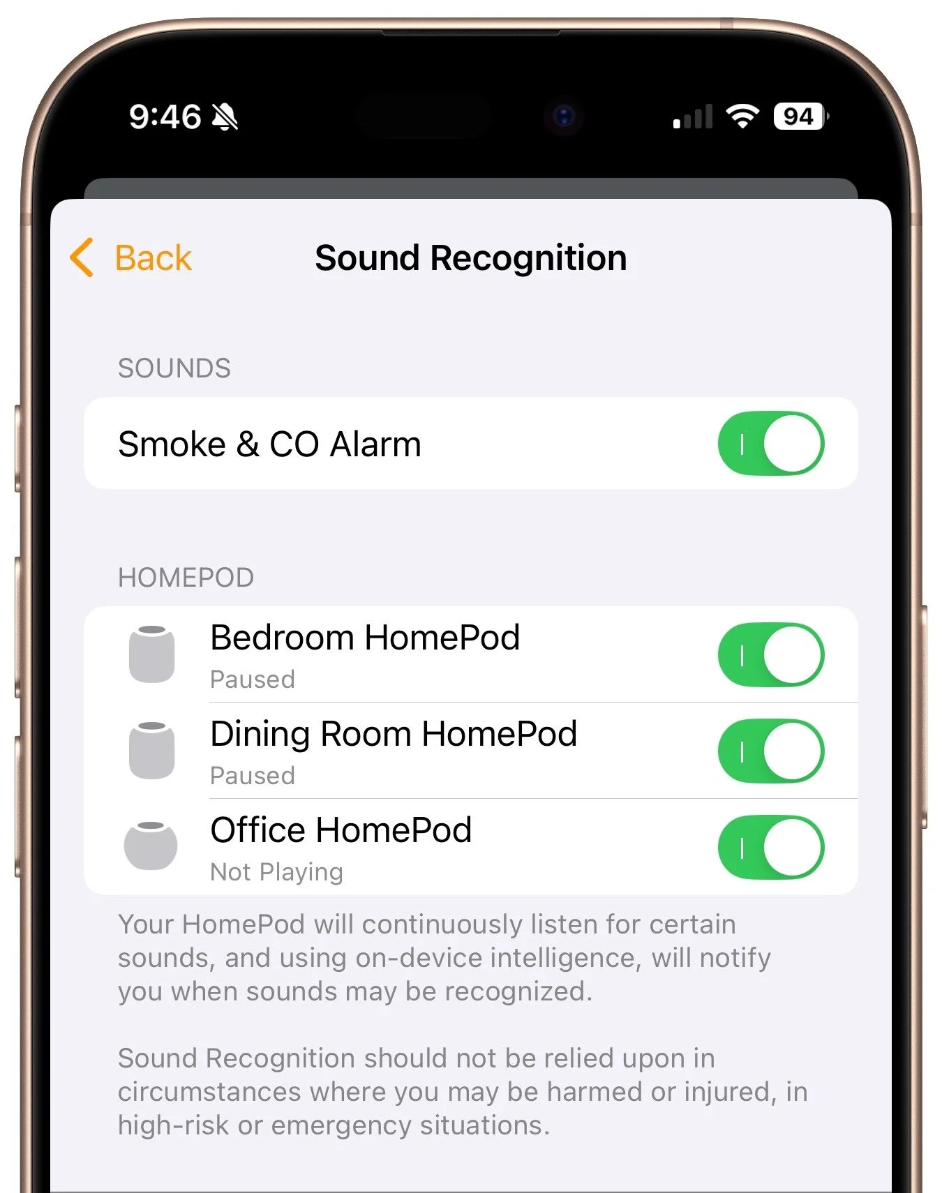 Although we think about HomePods as being useful for playing audio and responding to Siri commands, they can do more. HomePods can send a notification to your iPhone if their built-in microphones recognize the piercing squeals from smoke and carbon monoxide alarms. If you are away from home, that notification could help you alert neighbors and call 911, shaving minutes off response times. To turn the feature on, open the Home app, tap the ••• button in the upper-right corner > Home Settings > Safety & Security > Sound Recognition, and turn on the switches for Smoke & CO Alarm and any HomePods you have.