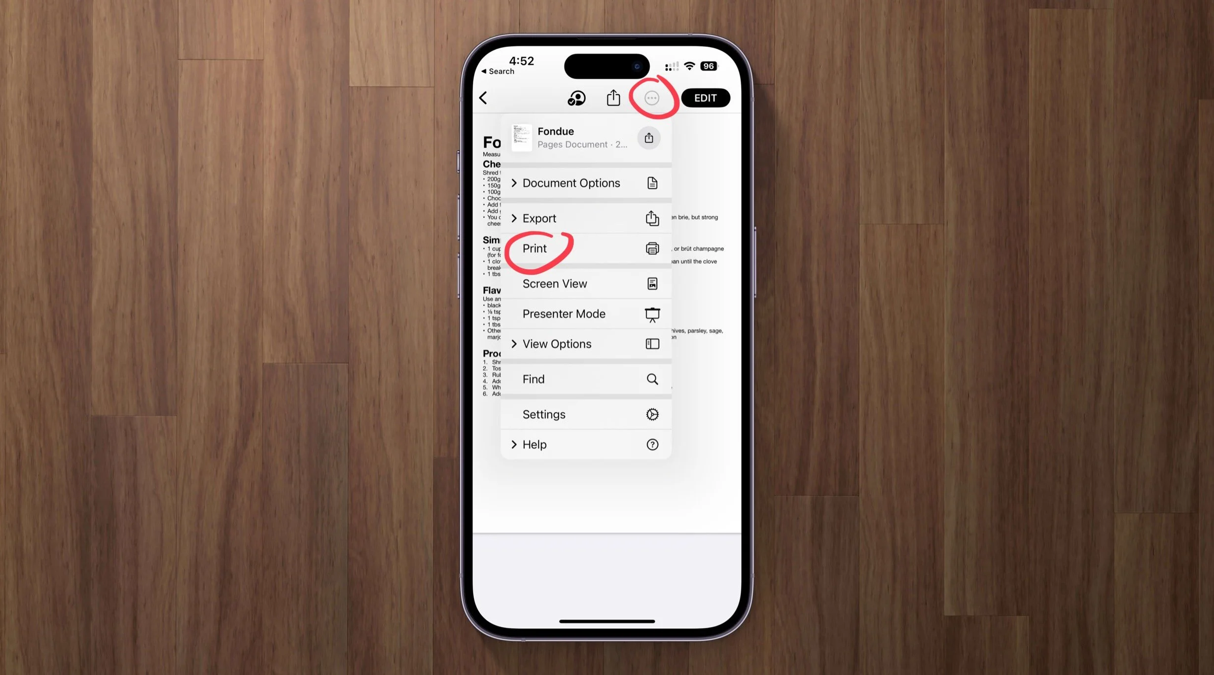 To print from some other apps such as Reminders, Pages, Numbers, Microsoft Outlook, Gmail, or Google Docs, tap the three dots and look for Print in the menu. Some apps make you drill down the menu further under something like "Share" or "Export". The appearance of the three-dot icon and the menu looks different depending on the app you are in.