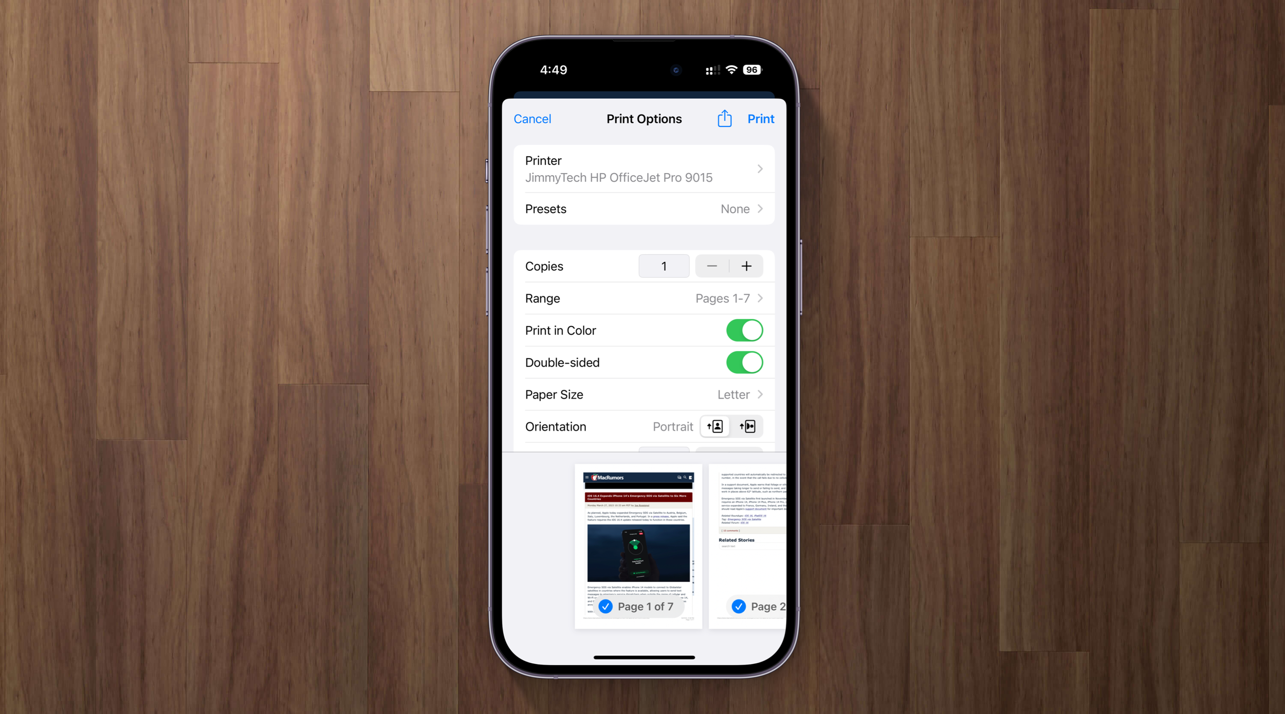 At the printer menu, make sure that everything is set properly. Then tap the Print button in the upper right corner. Your list of options may be different depending on the capabilities of your printer and the app you are printing from.
