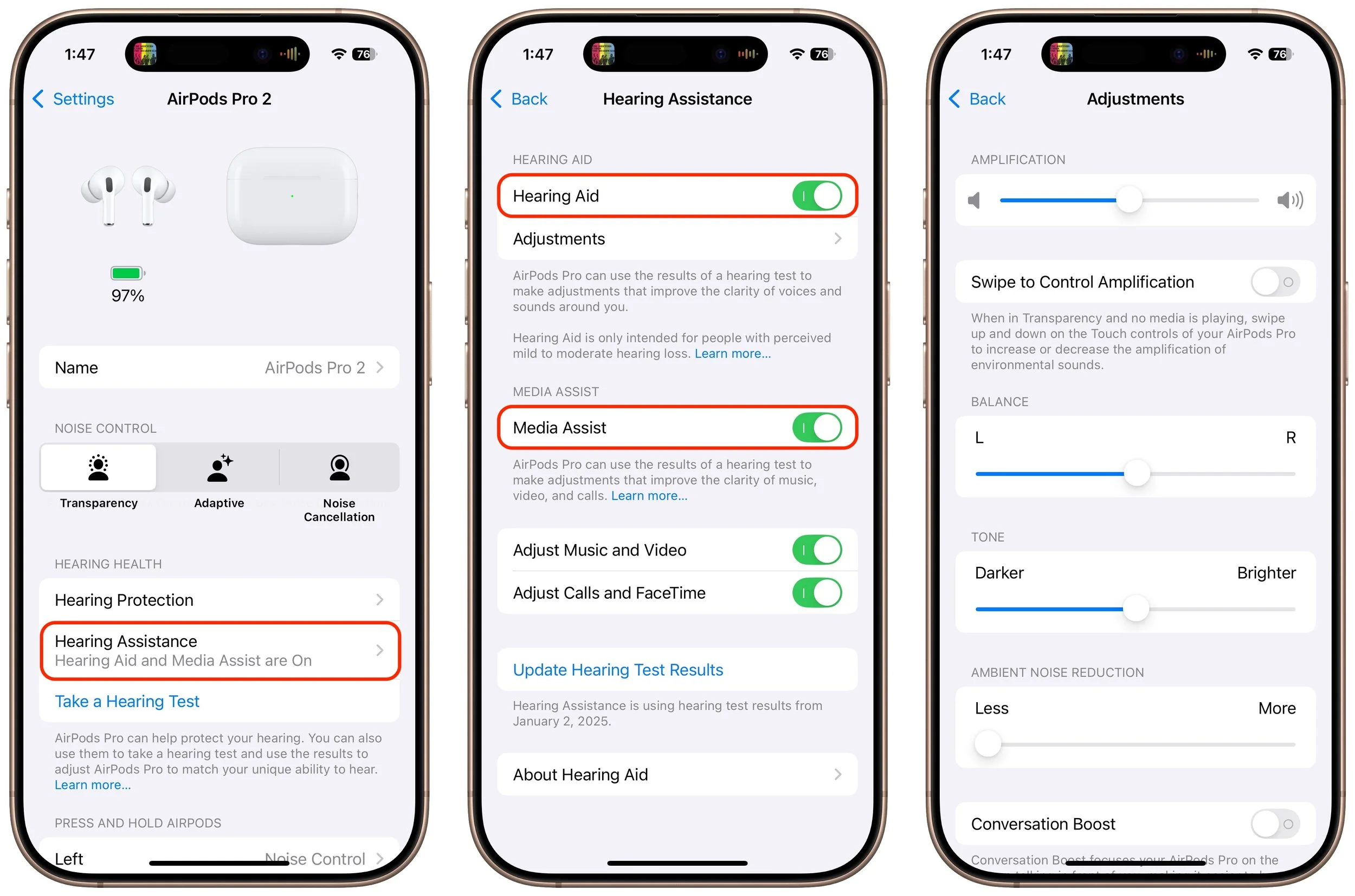 Media Assist: This feature improves audio quality for music, videos, and phone calls using your hearing test results. You can toggle it separately for Music/Video and Calls/FaceTime.