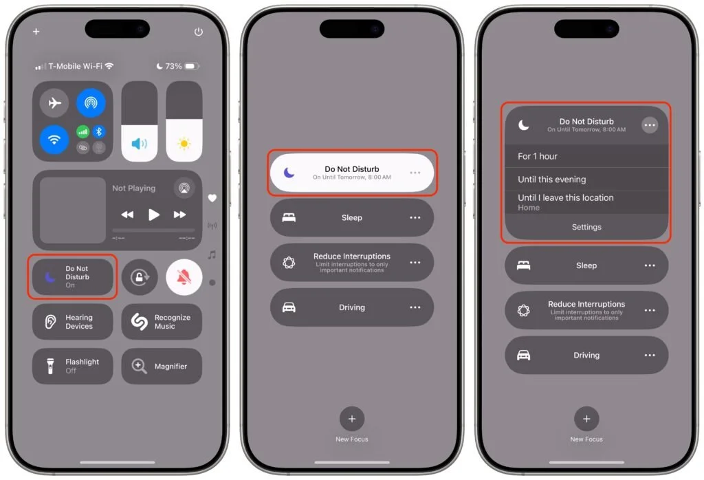 Use controls: Tapping an icon in Control Center usually either toggles a setting (like Orientation Lock and Silent Mode) or opens an app (like Magnifier or Wallet). Many show additional options when you touch and hold them (tap the Focus icon to toggle Do Not Disturb; touch and hold it to access more options, each of which offers even more settings). A few controls allow direct manipulation (like Now Playing, Volume, and Brightness).