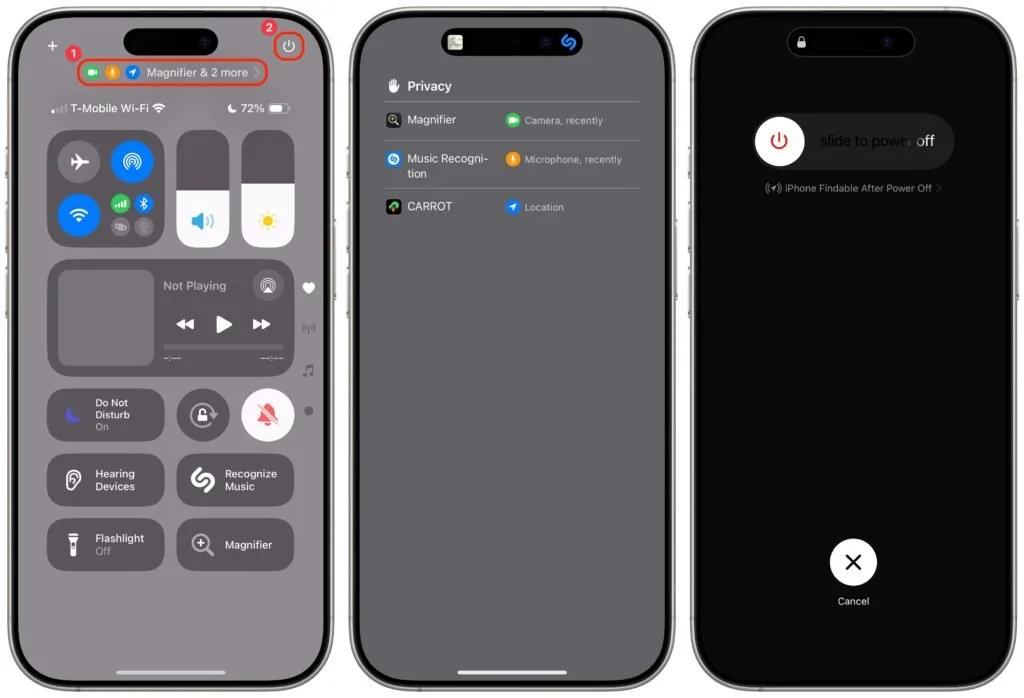 Check privacy status alerts: In the middle of the screen, you may see one or more small icons and an app name ➊. That indicates the app has permission to do things like track your location, use the camera, or record with the mic. Tap that area to see more details.