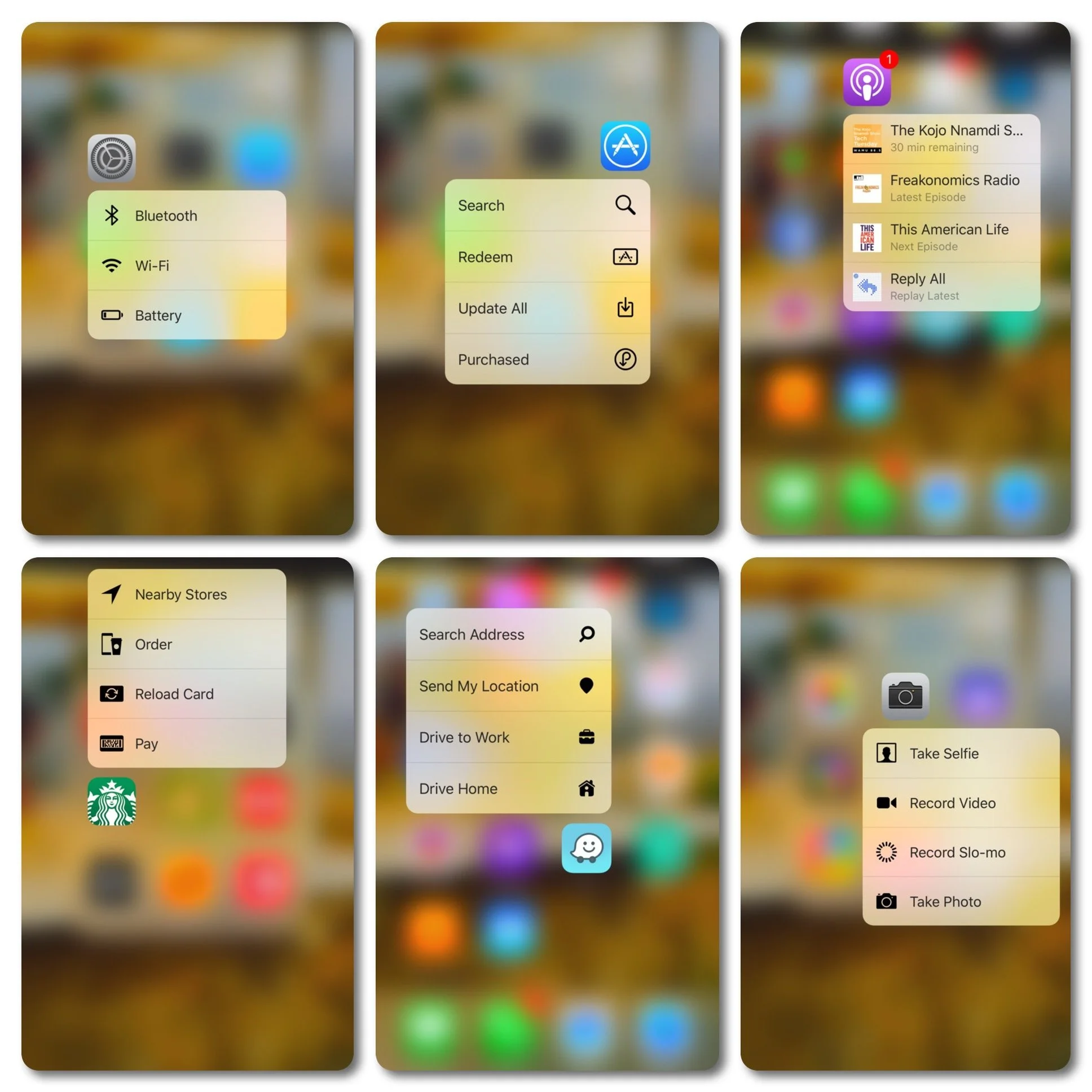 iPhone 6s and 6s Plus added a pressure-sensitive screen feature called 3D Touch. One way this is used is with app icons on your home screen. If you have a supported iPhone you can press icons hard to activate. If supported by the app this brings up a menu allowing you to jump directly to certain parts of the app. This includes built-in and third-party apps.You'll need to play around to discover what it can do, but some of my favorites include:
