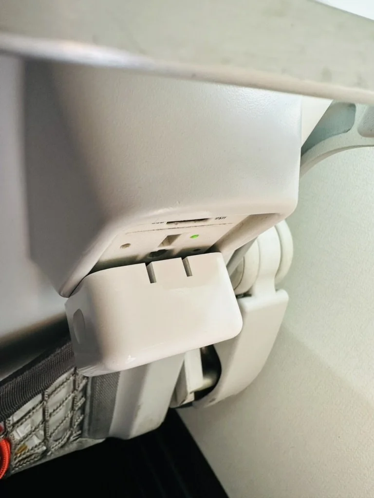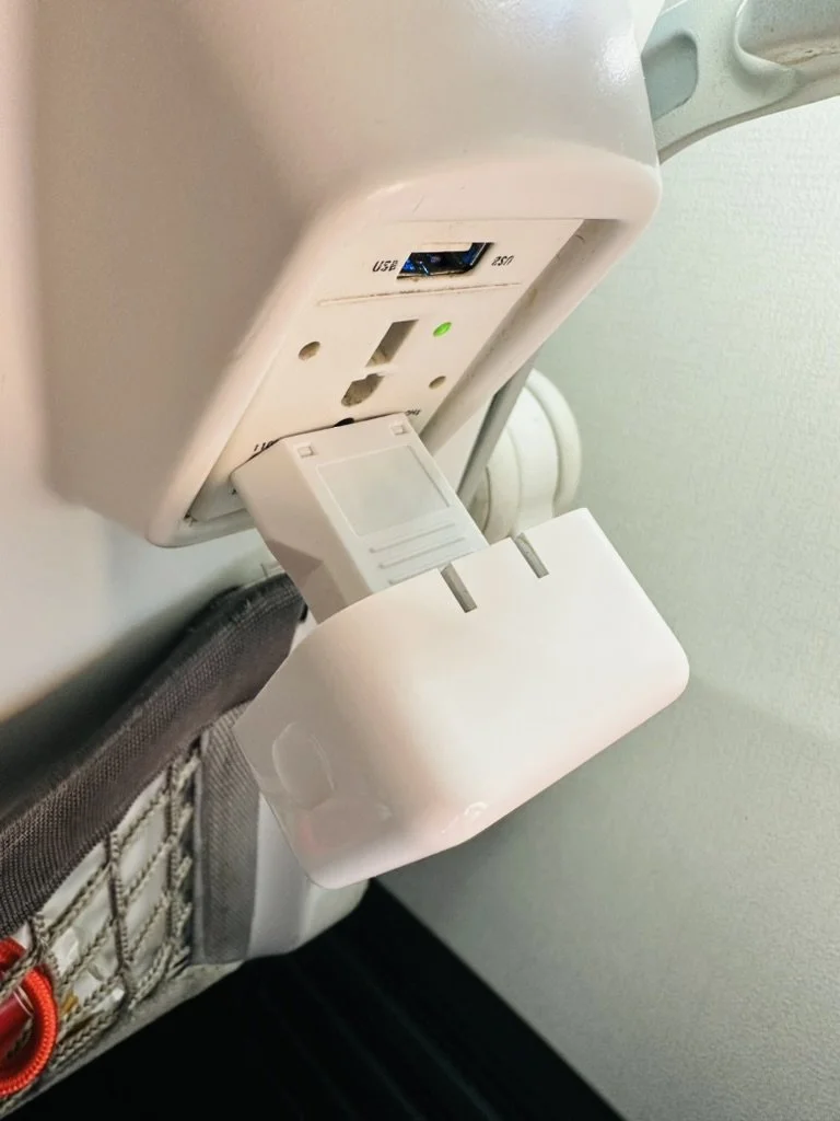 All too often, I've had trouble where the mere weight of my iPhone or MacBook power adapter is enough to pull it from its own airplane power socket. Why are they so loose? If the plug at your seat is one of the universal outlets that can accept any plug, you might find that an inexpensive Europlug adapter might have a more secure fit. I always carry one in my travel bag, even when I travel within the US. Specifically, I fly Alaska Airlines, and I always have this problem on their planes. And weirdly, the plug is recessed slightly, so the new MacBook Air Dual Charger doesn't insert fully. The adapter solves this problem as well.