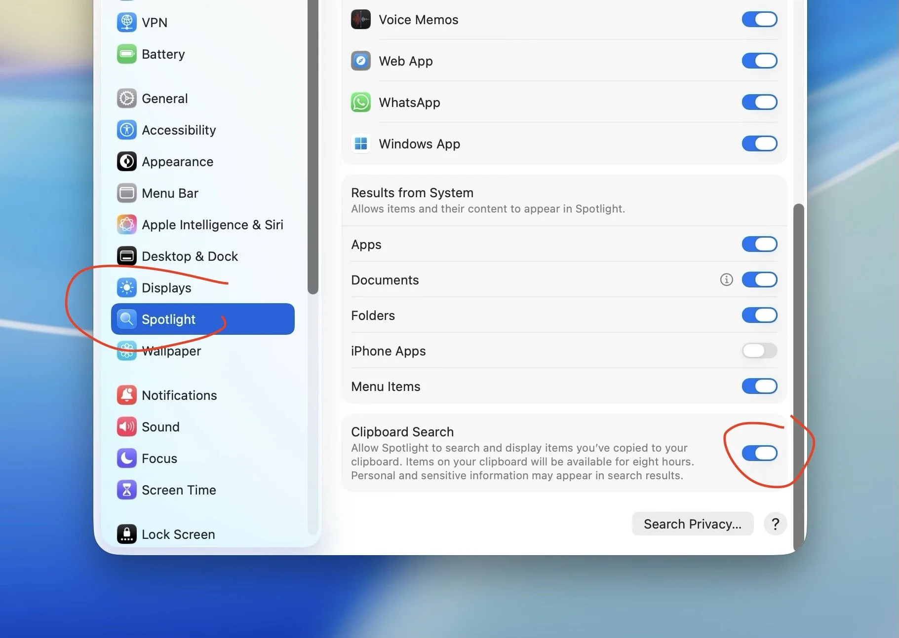 To enable clipboard history, visit the Apple menu > System Settings > Spotlight. Scroll to the bottom and turn on “Clipboard Search”
