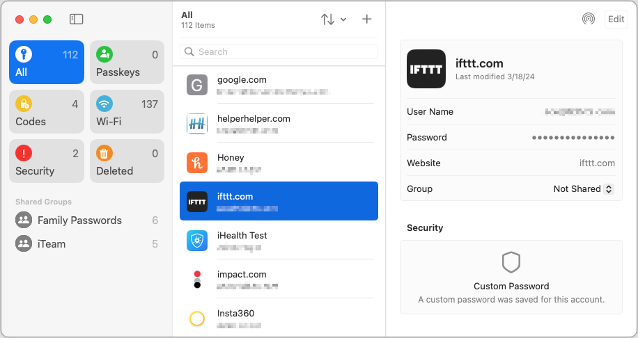 Shared Groups: If you use Family Sharing, you automatically get a Family Passwords group to simplify sharing important accounts with your family members. But you can also share accounts with other users of Apple Passwords. To move an account to a group, choose it from the Group pop-up menu.