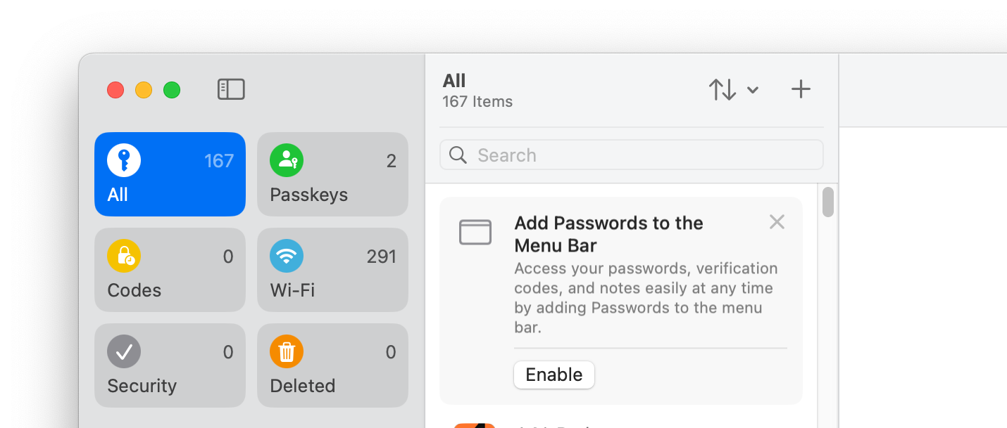 You'll find the Passwords app in your Applications folder in Finder or in Launchpad. For easier access, you can drag it to your Dock, or after opening it go to the Passwords menu > Settings > Show Passwords in Menu Bar. Beginning with macOS 15.4 it should suggest that to you in a banner in the app.