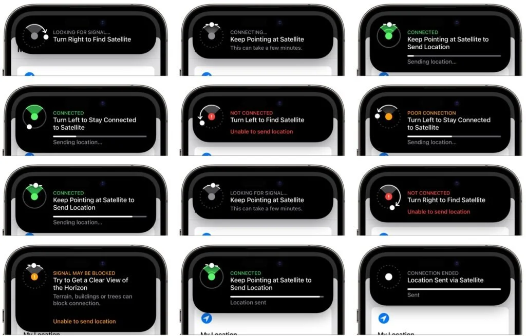 Find My will then start directing you to turn left and right, holding your iPhone up to the sky and pointing it at the satellite. A circular direction-finder shows which way to go and when you’re pointing in the right direction. If it fails (as it did in the lower-left message below), you’ll be directed to get a clear view of the horizon. If you’re in a deep valley, climbing higher may solve the problem. The process isn’t quick, but the constant feedback and progress bar ensures that you feel like it’s doing something the entire time.