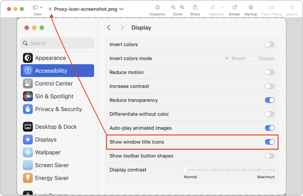 I'm a big fan of the Mac’s window file icons... you know, those little icons that appear in window title bars next to the filename. They’re not just cosmetic—you can use them just like the Finder icon for the open document. You can drag one to Mail to attach the document to a message, to a Web browser to upload it, or to any other location just as you would drag a document’s icon in the Finder. In macOS 11 Big Sur, Apple hid the icon until you hovered the mouse over just the right spot of the filename (which can be an exercise in patience), but starting with macOS 12 Monterey, they provide an option to show them all the time. To enable it, go to the Apple menu > System Settings > Accessibility > Display > Show window title icons.
