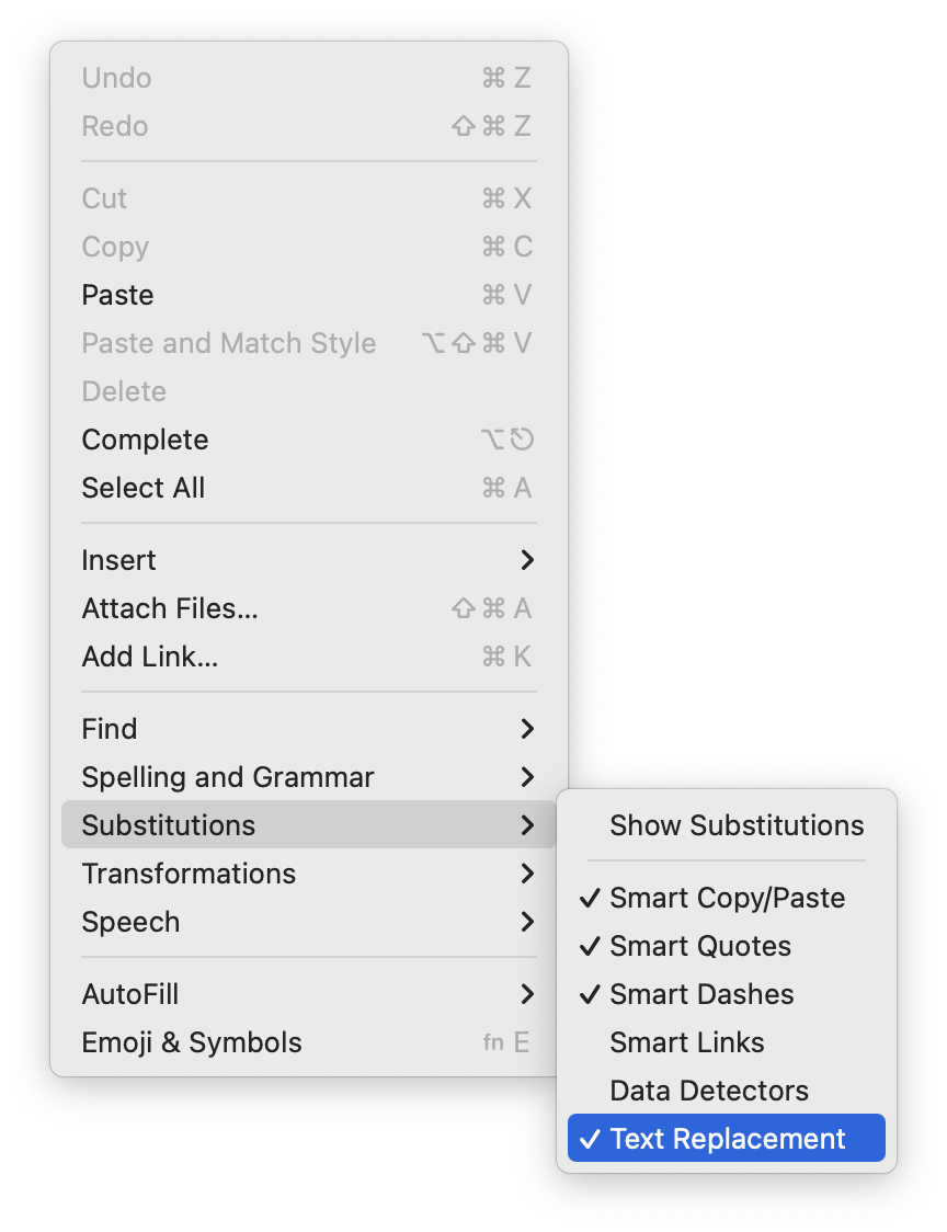 Apple provides a handy ecosystem-wide feature that replaces a typed abbreviation of your choosing—say “=eml”—with text you specify, like your email address. (Seriously, copy that one so you don’t have to type your email address repeatedly.) These automatic text replacements sync via iCloud so you can use them on the Mac, iPhone, and iPad. Find them on the Mac in System Settings > Keyboard > Text Replacements and on the iPhone and iPad in Settings > General > Keyboard > Text Replacement. They’re great, but it can be mysterious when they stop working on the Mac. The likely culprit? A menu item getting turned off. So, if text replacements aren’t working in a particular app, go to the menu bar and choose Edit > Substitutions > Text Replacement to turn them back on.