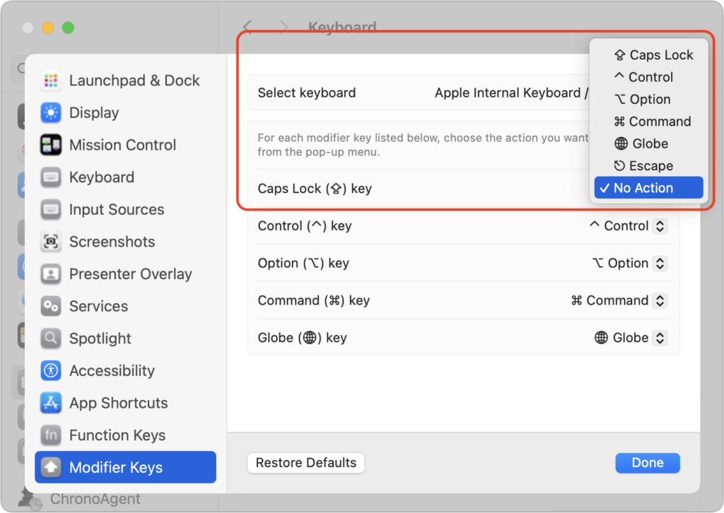 This tip isn't for most people, but read on if you struggle with accidentally touching the Caps Lock key while typing and having your text suddenly TURN INTO CAPITAL LETTERS, or accidentally enabling it when entering a password. If you don't use the Caps Lock key, you can prevent this mistake by disabling it entirely or remapping it to another modifier key. In macOS 13 Ventura and later, click the Apple menu > System Settings > Keyboard > Keyboard Shortcuts > Modifier Keys, and choose from the pop-up menu next to Caps Lock. (In earlier versions of macOS, click the Apple menu > System Preferences > Keyboard > Modifier Keys.)