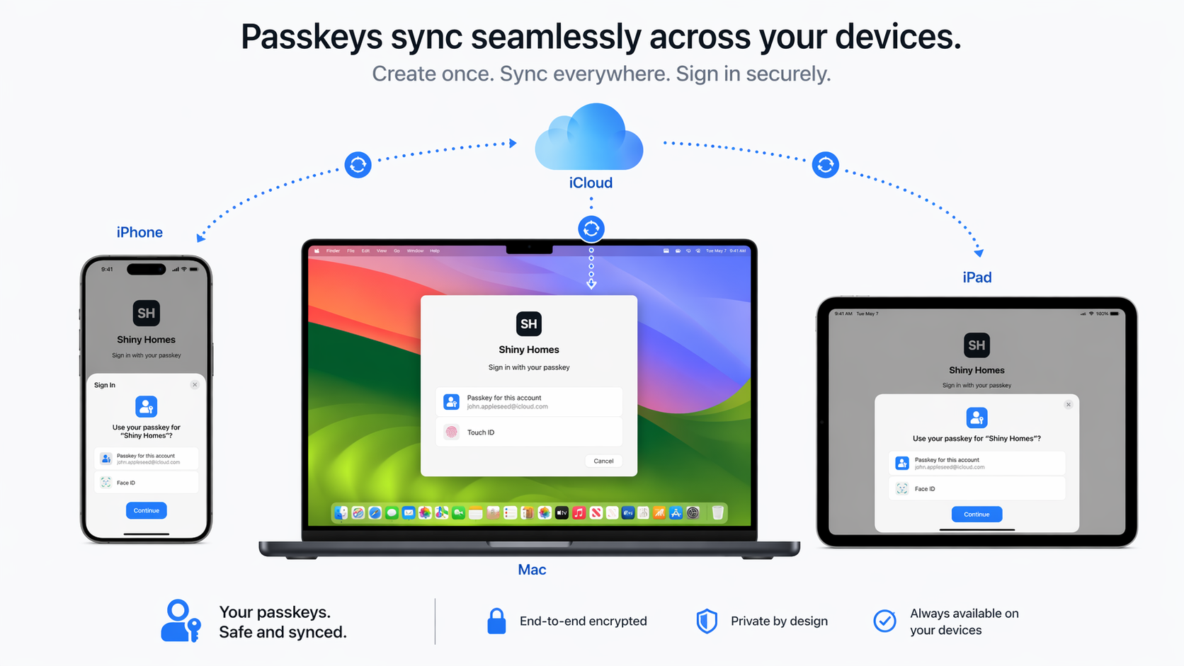 Apple syncs your passkeys automatically across all your devices through iCloud Keychain