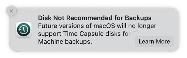 Disk Not Recommended for Backups. Future versions of macOS will no longer support Time Capsule disks for Time Machine Backups.