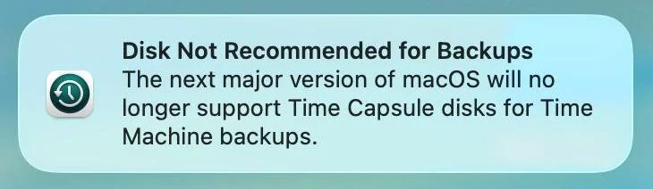 Disk Not Recommended for Backups. The next major version of macOS will no longer support Time Capsule disks for Time Machine backups.